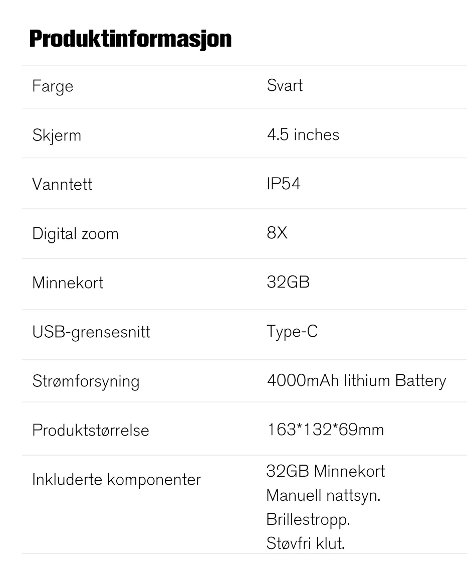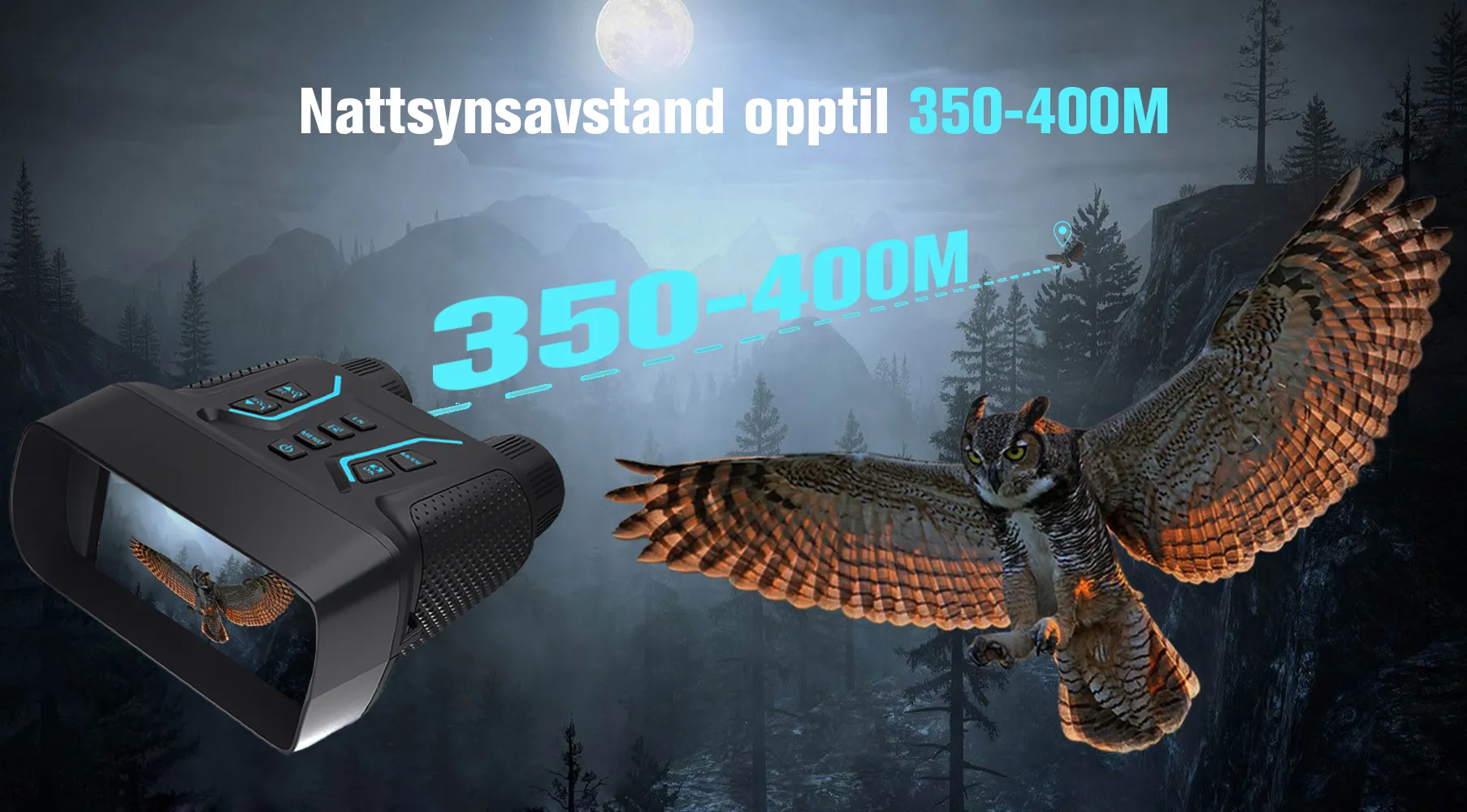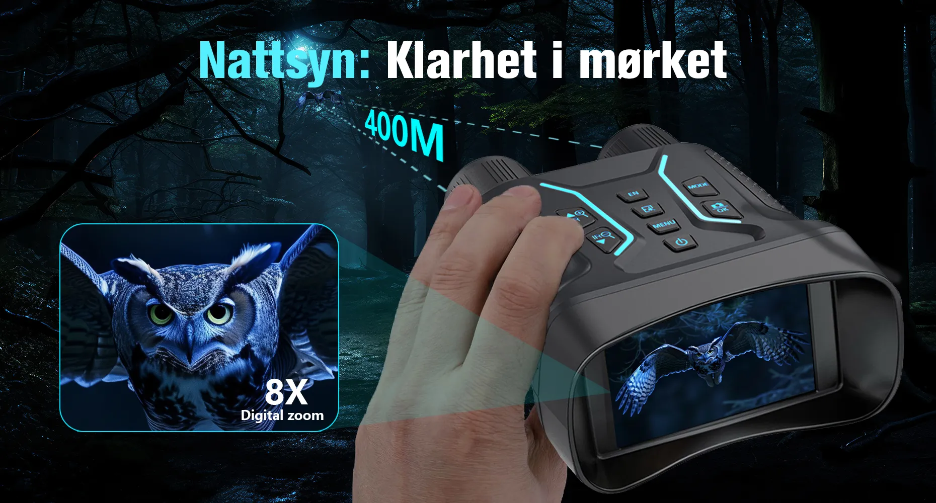Denne nattekikkerten er utstyrt med 8x digital zoom, slik at du kan fange skarpe bilder av objekter langt unna. Uansett om det er for observasjon eller for å se på ville dyr, gir zoomfunksjonen bedre syn og forstørrelse.